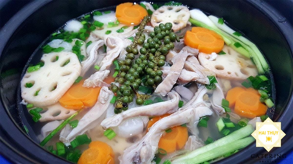 - Cho nước dừa xiêm và thêm nước dùng hoặc nước lã vào nấu sôi nhớ thường xuyên vớt bọt để nước trong, cho thêm tiêu xanh, hành tím, sả nấu cho bao tử mềm như ý rồi nêm lại theo khẩu vị