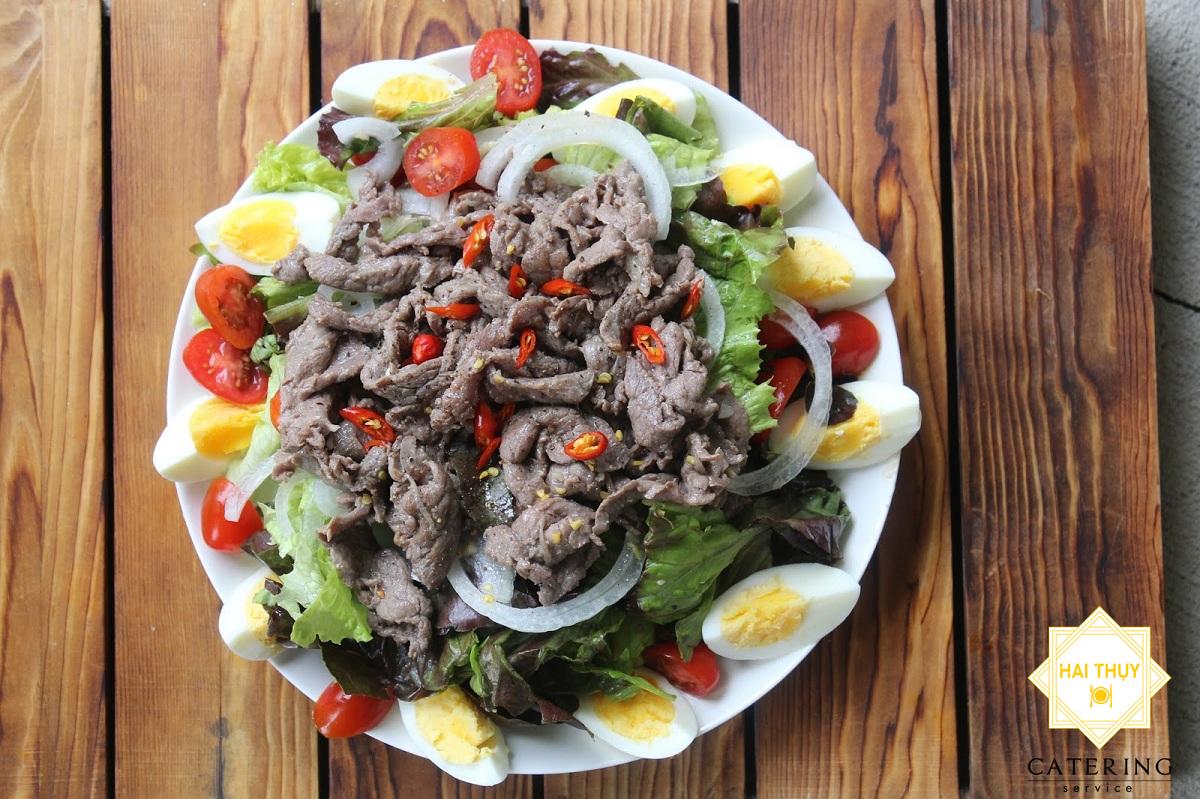 - Xếp salad, thịt bò, trứng gà, cà chua ra dĩa/tô lớn. Rưới hỗn hợp nước mắm lên và trộn nhẹ đến khi vừa ăn.