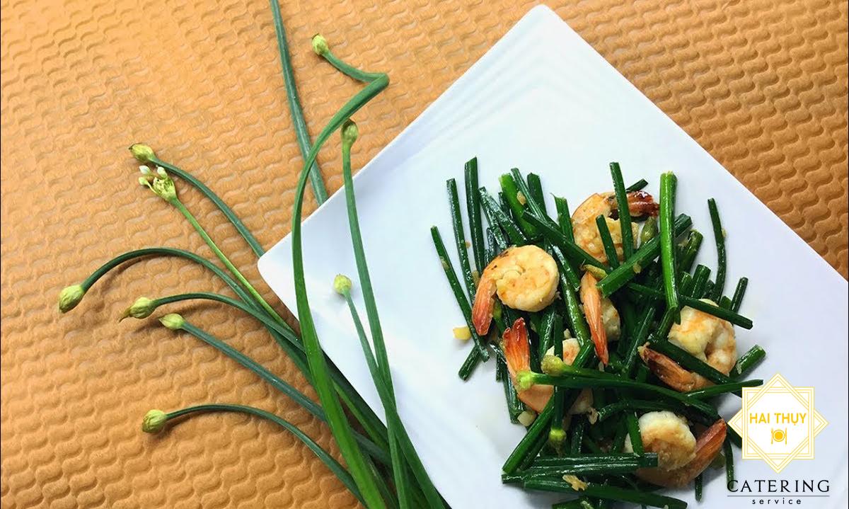 - Chảo nóng cho 2 muỗng xúp dầu, 1 muỗng xúp hành lá bằm vào phi vàng, cho hẹ vào xào nhanh tay khoảng 6 phút, khi hẹ xanh chín, nêm tiêu, bột ngọt, nước mắm, cho tôm, mực vào đảo nhanh tay, nhắc xuống.