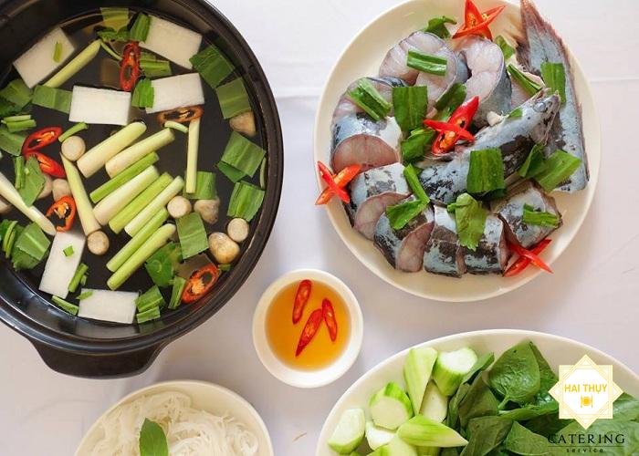 - Múc cá ra thố dùng kèm với bún và rau mồng tơi, mướp hương, chấm cá với nước mắm mặn, ớt cắt lát.