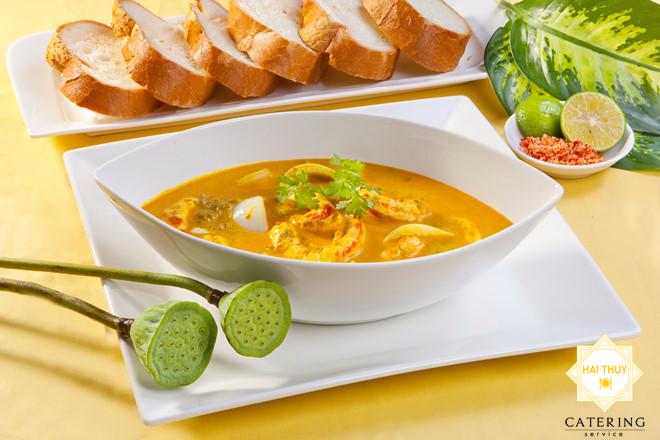 - Múc cà ri ra tô, cho lên trên phần hành tây, ớt, ngò cho đẹp mắt, dọn ăn nóng cùng với cơm, bánh mì hoặc bún.