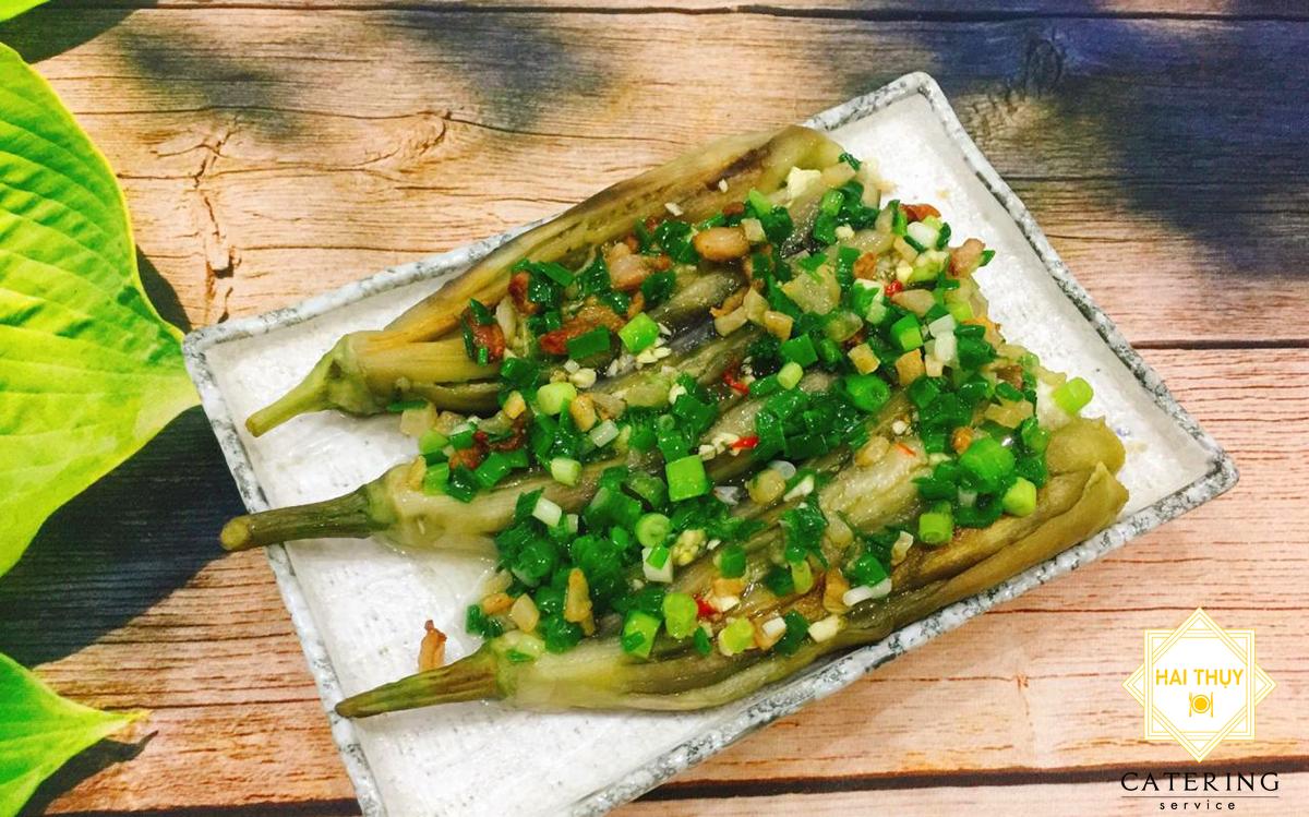 - Gắp cà tím ra dĩa, trét mỡ hành.