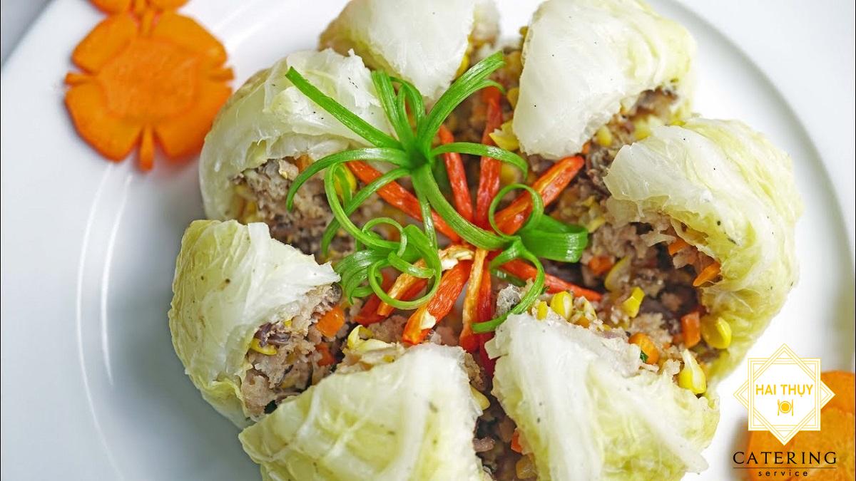 - Trải từng lá bắp cải, cho nhân vào gói chặt, dùng hành lá cột lại.