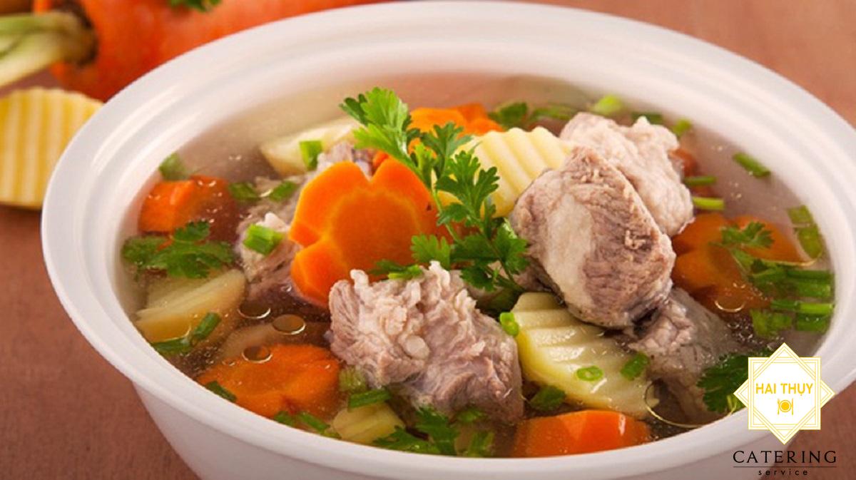 - Nấu sôi 1,5 lít nước lạnh, cho sườn vào hám lửa riu riu, vớt bọt, kế đen cho cà rốt vào, gần mềm cho khoai tây, cuối cùng là su su vào. Khi tất cả chín mềm cho hành lá cắt ngắn vào, nêm 1/2 muỗng cà phê tiêu, 1/2 muỗng cà phê muối, 1/2 muỗng cà phê bột ngọt, 1/2 muỗng cà phê nước mắm. Nêm vừa ăn nhắc xuống.