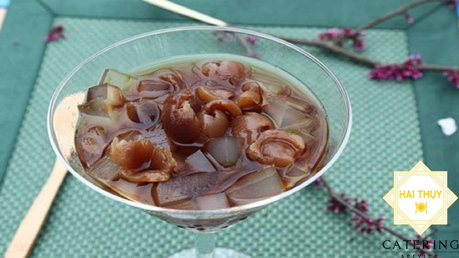- Chờ nồi chè nguội hẵn rồi cho nho và thạch vào cùng đem để tủ lạnh. Hoặc có thể cho từng thứ vào chén rồi đập đá nhỏ vào cùng.