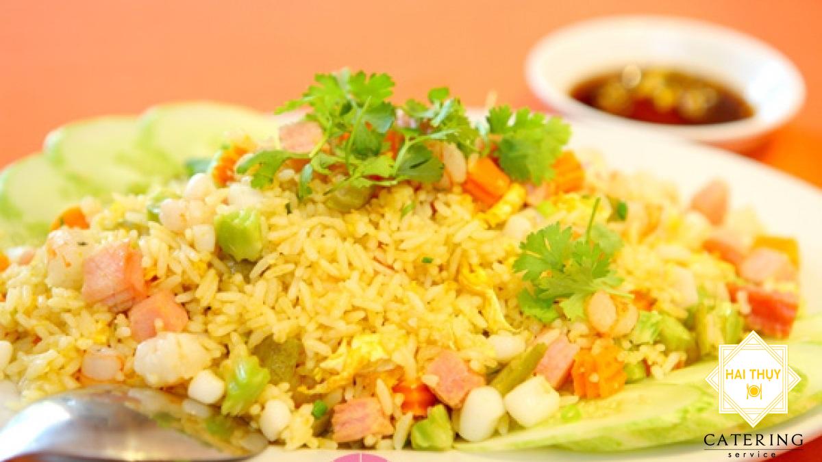 - Phi thơm hành với 1 chút dầu ăn, cho cơm vào, thêm 1 thìa nước tương, đảo đều tay cho hạt cơm được tơi. Khi thấy hạt cơm săn lại thì cho giò lụa vào.