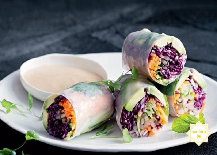 - Trải bánh tráng lên mặt phẳng rồi cuốn theo thứ tự: 2 lát quả bơ, 2 ngọn rau mùi, 2 ngọn rau bạc hà, một ít bắp cải tím, cà rốt, dưa chuột, giá đỗ. Cuốn hai đầu bánh tráng và cuộn chặt tay.