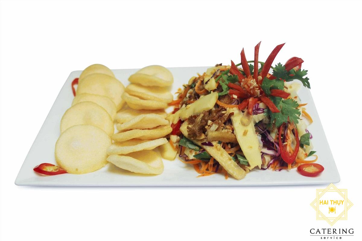 - Cho gỏi ra đĩa, trang trí cùng cà tỉa hoa cho đẹp mắt.