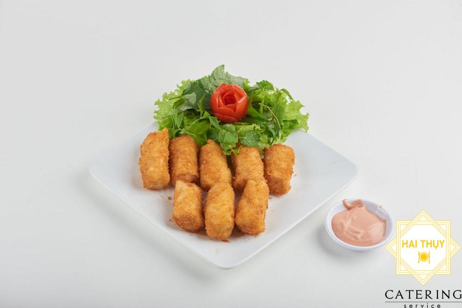 - Đun sôi 500ml dầu ăn. Nhúng cuộn chả giò vào trứng rồi lăn qua bột chiên xù. Lần lượt thả vào chảo chiên chín vàng giò thì vớt ra đẻ ráo dầu.