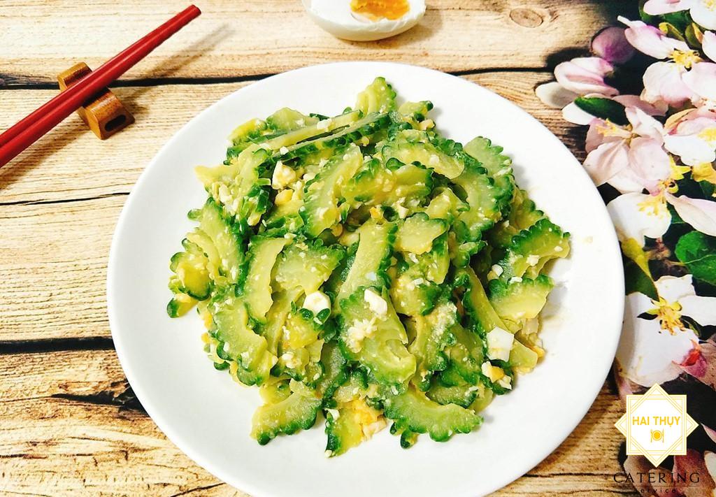 - Chảo nóng cho 2 muỗng xúp dầu, 1 muỗng xúp tỏi bằm vào phi vàng, cho khổ qua vào xào, thêm chút nước lạnh, đậy nắp lại 5 phút, cho vào 1/2 muỗng cà phê tiêu, 1/2 muỗng cà phê muối, 1/2 muỗng cà phê bột ngọt, hột vịt vào đảo đều, hột vịt thấm vào khổ qua và rời ra, cho hành lá vào.