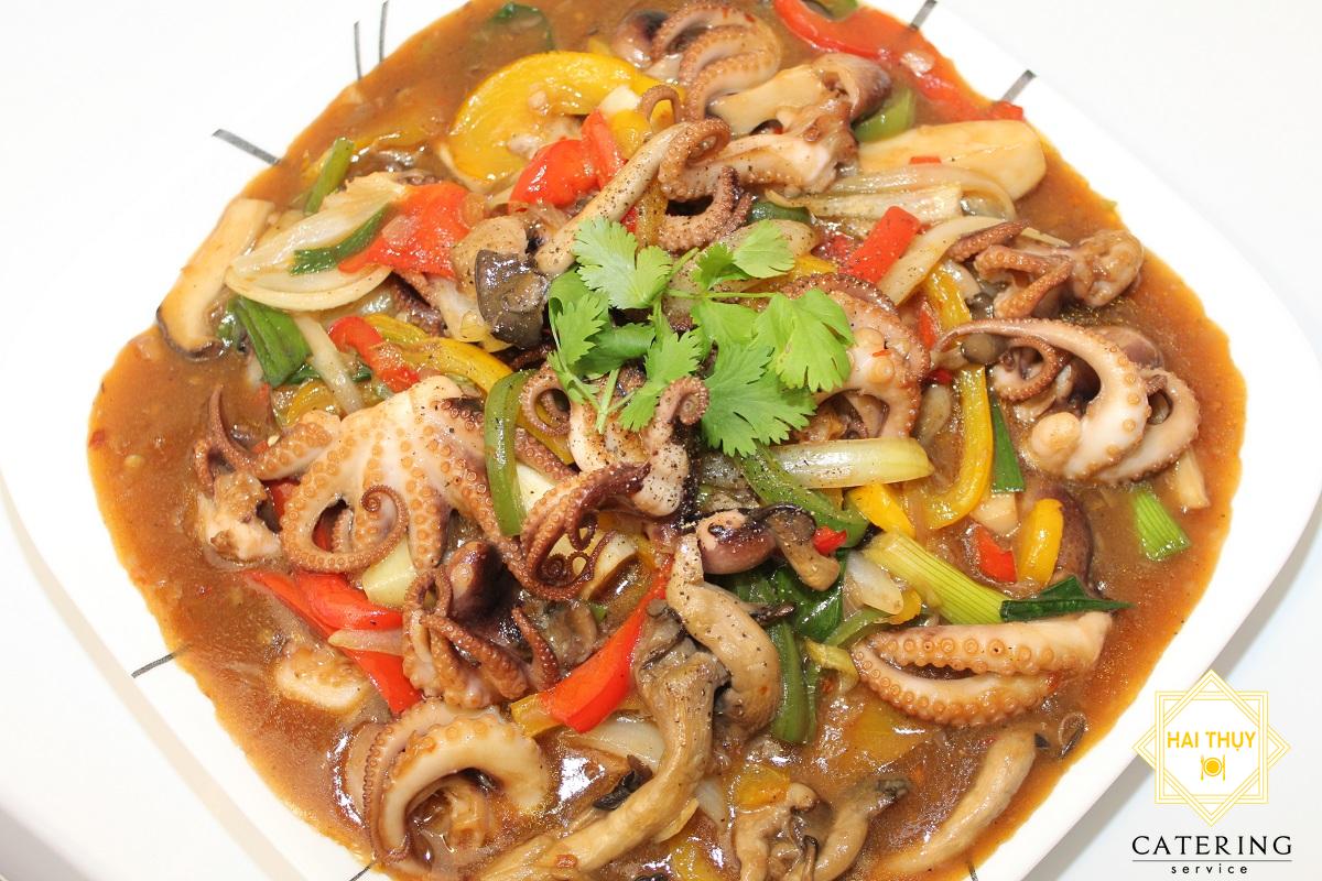 - Đổ dầu vào chảo đun nóng, phi thơm tỏi, cho mực vào xào. Nêm gia vị (đường và hạt nêm). Khi mực bắt đầu hơi săn lại, cho ớt và cần vào xào, đảo nhanh tay.