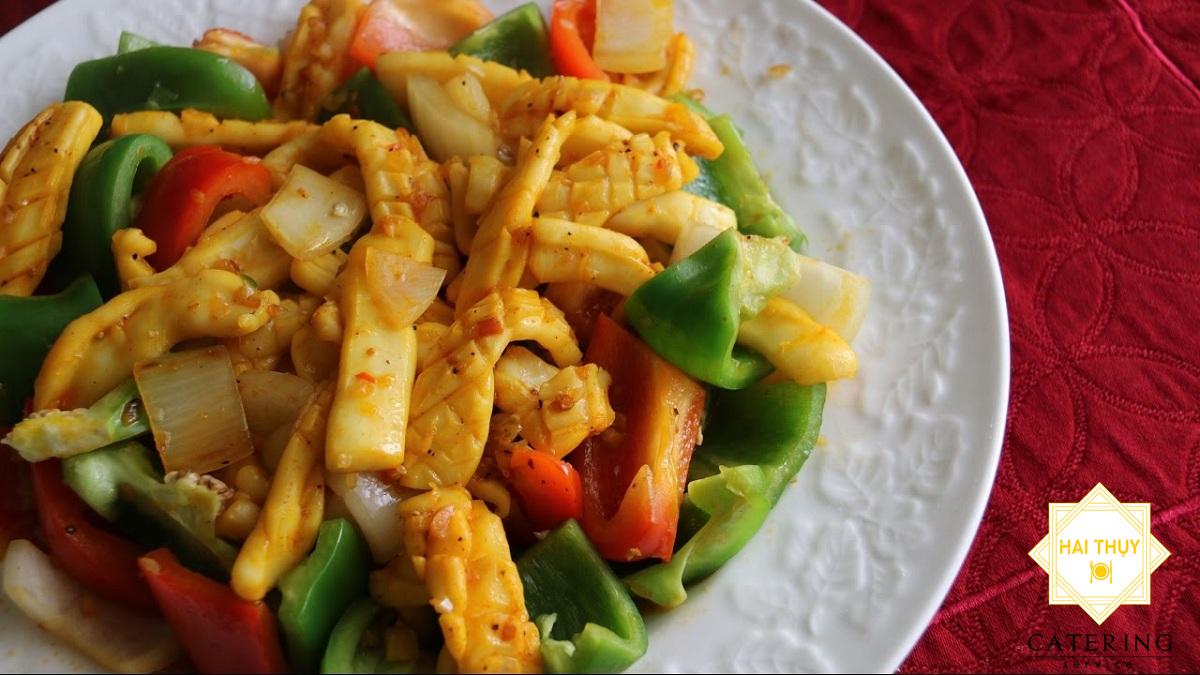 - Chảo nóng cho 2 muỗng xúp dầu. 1 muỗng xúp tỏi bằm vào phi vàng, cho mực vào xào nhanh tay, rồi cho ớt Đà Lạt, hành tây, Vì chén nước dùng, nêm 1 muỗng cà phê tiêu, chút muôi, Vì muỗng cà phê bột ngọt, 1 muỗng cà phê dầu mè, 1 muỗng cà phê dầu hào vào. Nêm vừa ăn, cho ít bột năng quậy nước lạnh vào tạo sánh.