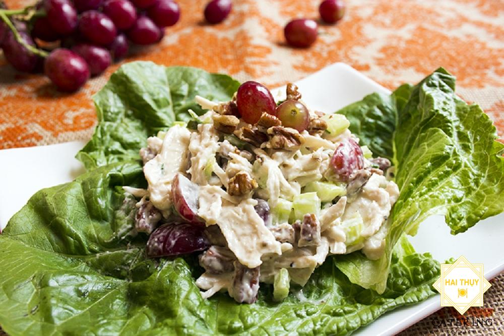 - Sau đó cho hạnh nhân vừa rang chín rắc lên trên bát thịt gà, tách bỏ hết phần hạt của nho xanh rồi tiếp tục cho vào cùng.