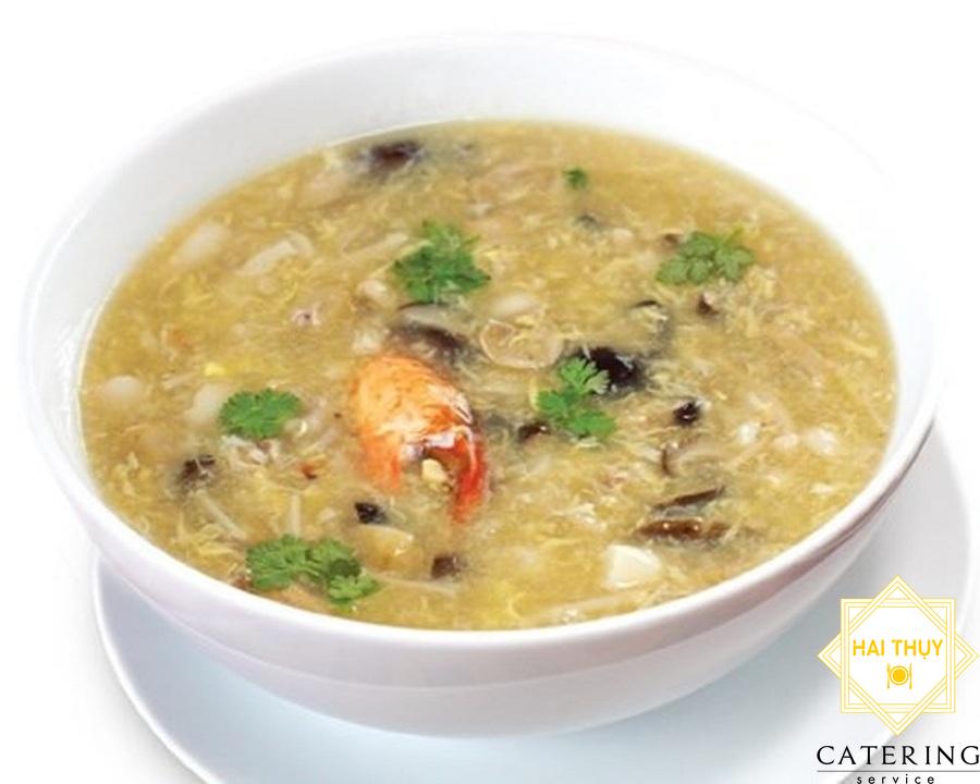 - Sau khi nấu nước dùng xong, tiếp tục nấu soup. Cho nước dùng cùng các loại nguyên liệu: thịt gà, nấm hương, hải sâm, gia vị, bắp xay vào nấu sôi lần 2. Khi sôi thì cho bột năng vào quấy đều cho tan. Để lửa liu riu. Sau đó tiếp tục cho trứng gà và dầu mè vào.