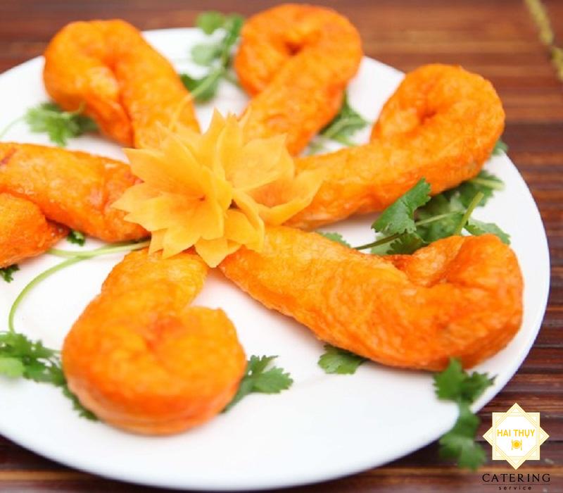 - Tàu hủ ky lá cắt hình tam giác, bỏ tôm vào cuộn lại, xong lấy dây quấn và gịch hai đầu lại (mục đích giữ tôm cho cong) làm phải nhẹ tay không thôi tôm bị bể