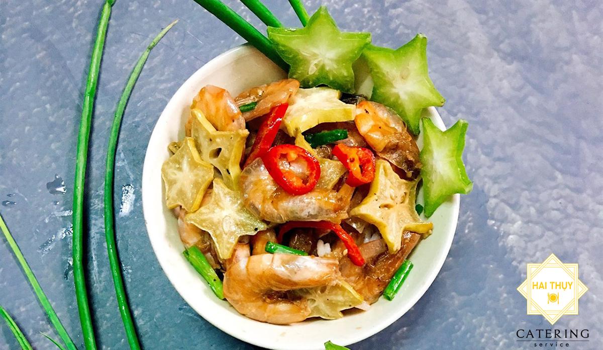 - Cho tôm vào xào, nêm 1 muỗng cà phê tiêu, 1 muỗng cà phê muối, 1/2 muỗng cà phê bột ngọt, xào cho tôm đỏ, thêm khế vào xào đều, cho 2 muỗng xúp đường vào đảo đều.