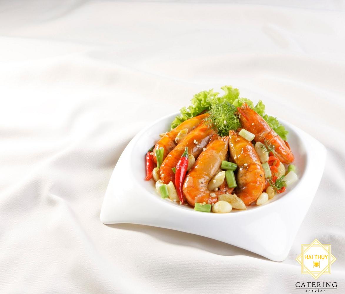 - Khi tôm chín thì cho nước mắm, hạt tiêu, mì chính một lượng vừa đủ vào tôm, đảo thật đều để các gia vị sẽ ngấm đều vào tôm. Khi tôm rang đã cạn nước và khô lại thì cho phần rau thì là thái nhỏ vào trong chảo tôm trộn thật đều rồi tắt bếp.
