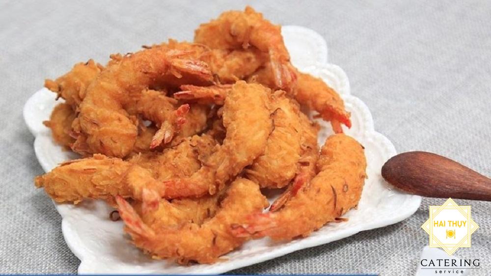 - Bắc chảo cho dầu vào trong đợi đến khi dầu nóng già thì thả tôm vào chiên vàng giòn. Tôm chín thì gắp ra đĩa có lót sẵn giấy thấm dầu là được.