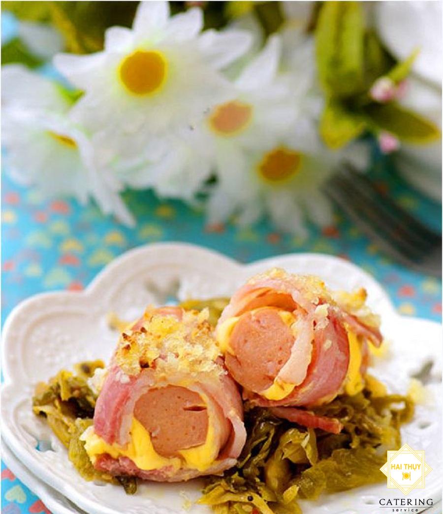 - Khía đường xoắn ốc dọc trên cây xúc xích. Sau đó cuộn xúc xích với phô mai lát. Bạn cuộn thêm bên ngoài là một lát thịt xông khói. Múc một ít vụn bánh mỳ rải đều trên mặt khay nướng đã lót sẵn giấy nhôm, sau đó xếp 3 cuộn xúc xích lên và tiếp tục dải một lớp mỏng vụn bánh mỳ còn lại lên trên mặt xúc xích.
